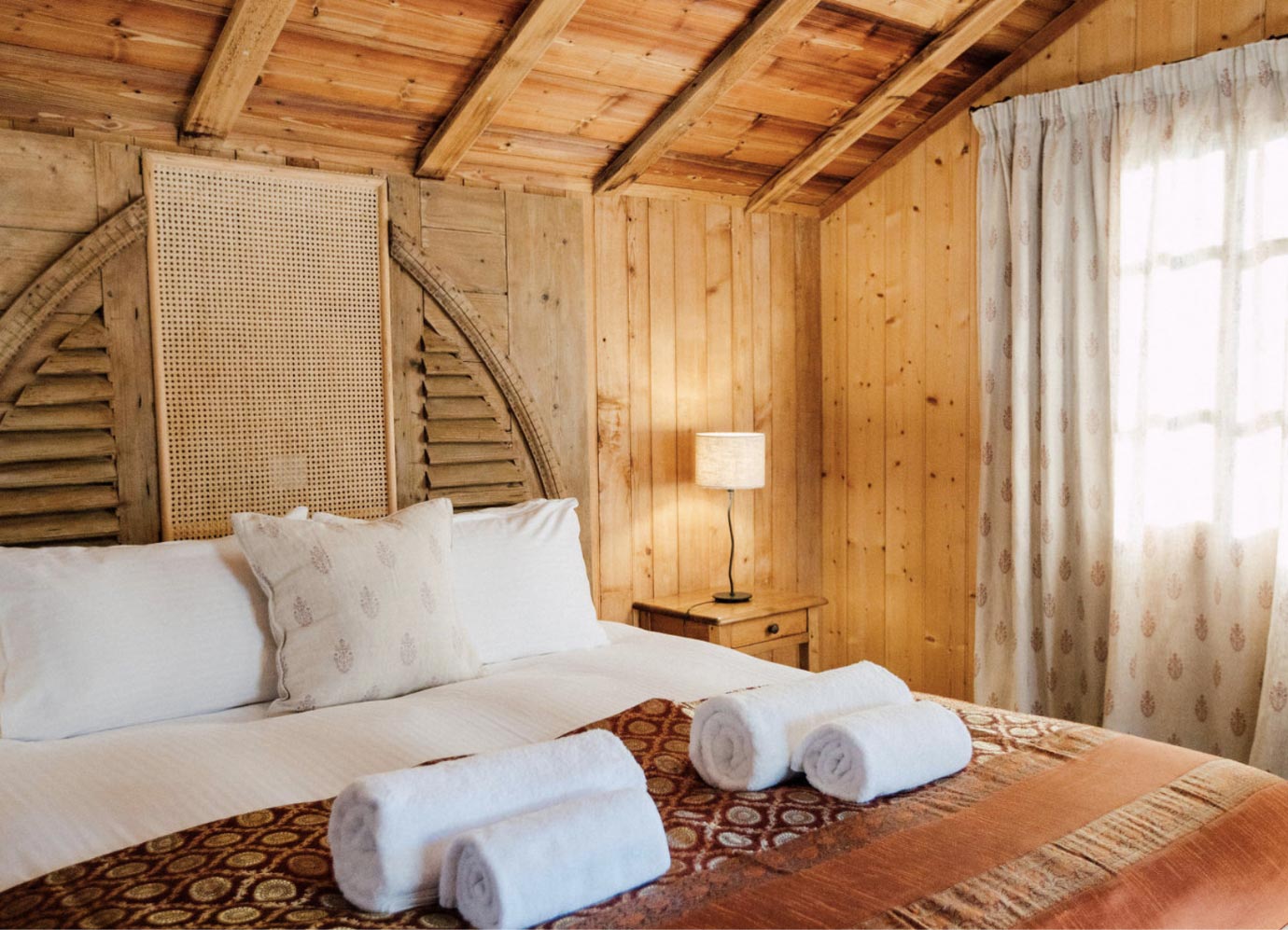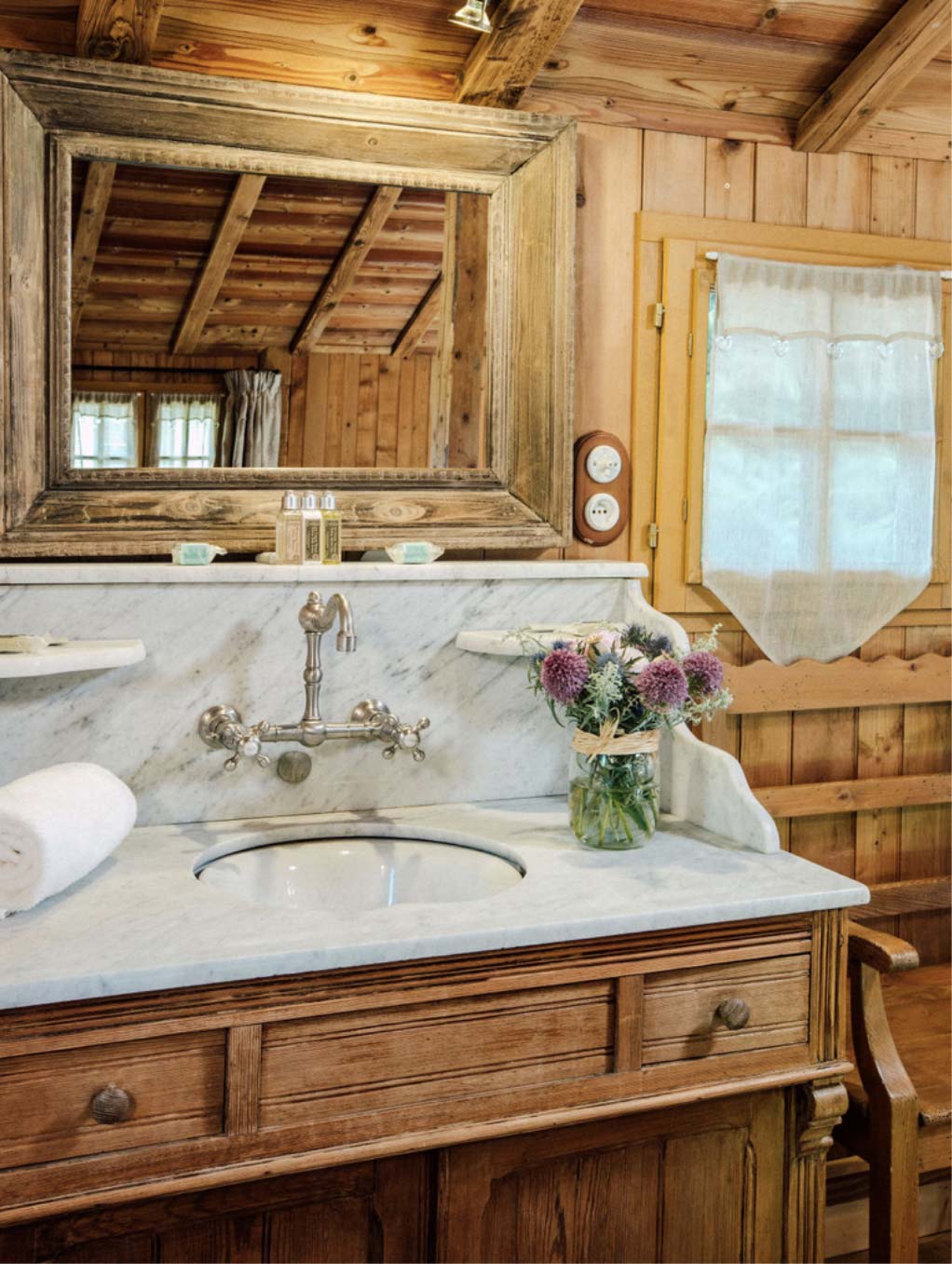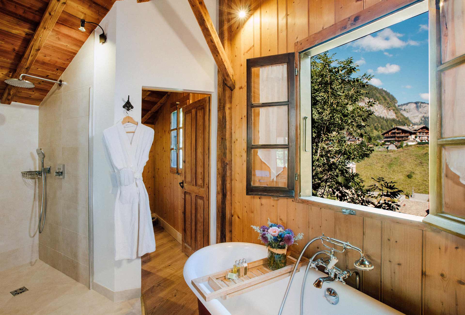 Les mariées de l’Hôtel Coutettaz choisissent presque toujours Atelier. Pas étonnant. Il y a de la place pour que tout le groupe se prépare, coupes de champagne à la main et papillons dans le ventre, tout en étant à l’écart de la maison principale pour plus d’intimité. En plus, c’est extrêmement photogénique – imaginez simplement une robe de mariée suspendue aux poutres en bois.