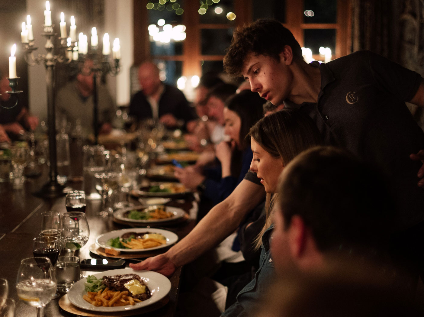 Notre cuisine figure parmi les meilleures de la région. Et l’expérience ? Elle mérite d’être racontée. Notre équipe chaleureuse mais discrète sert nos repas saisonniers de quatre plats dans une salle à manger accueillante, souvent éclairée aux bougies, qui marie parfaitement le chic à la française à la convivialité anglaise. Habillez-vous pour le dîner et commandez un apéritif ou installez-vous dans votre pull le plus chaud avec votre vin rouge réconfortant préféré ; mais laissez toujours une place pour le dessert.