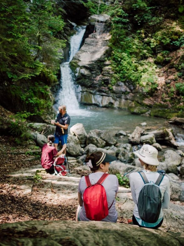 Le sentier passe devant la mairie, la bibliothèque, puis longe la rivière à travers la forêt jusqu’au parking du télésiège du Nyon. De là, montez à droite vers la cascade.